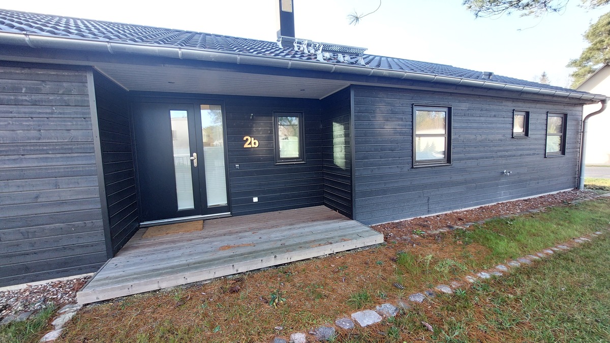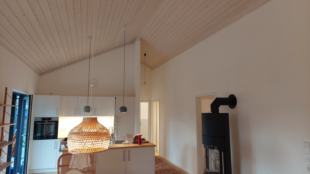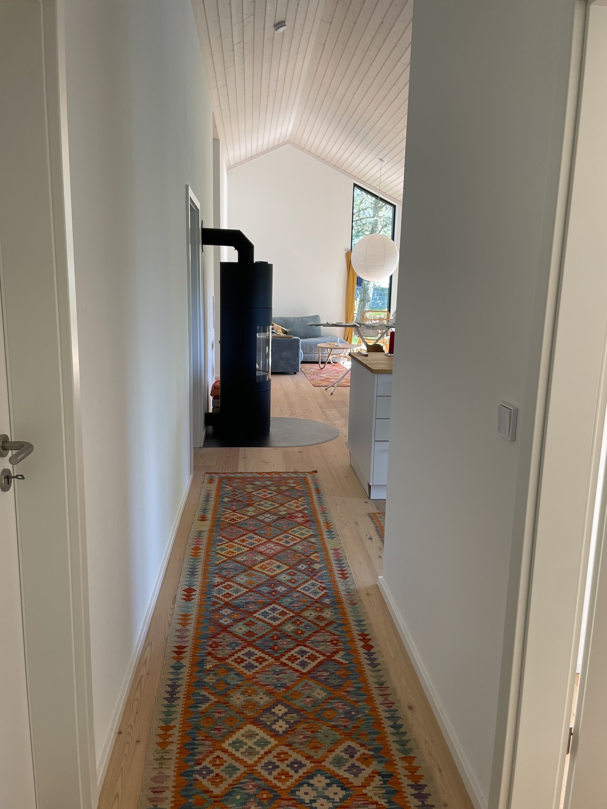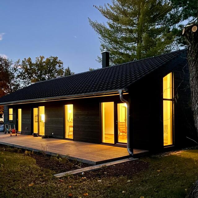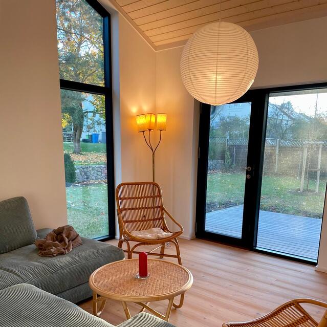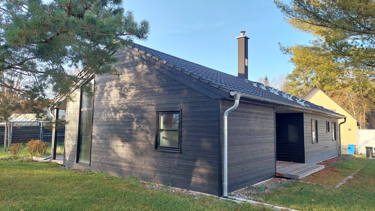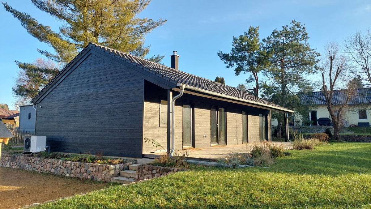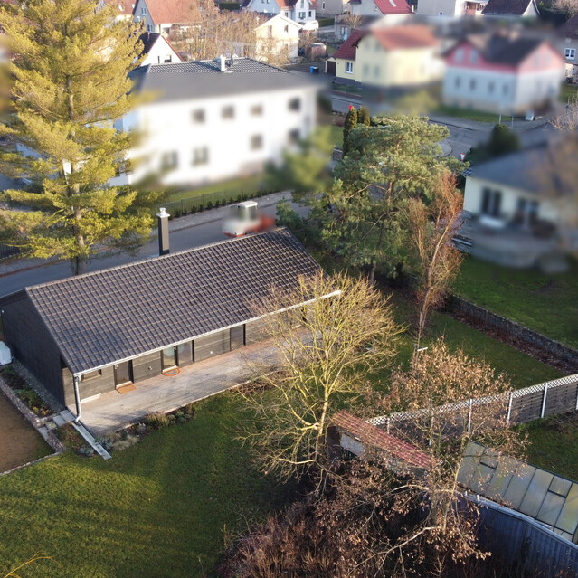 | Objektbeschreibung | Dieses freistehende, moderne und neuwertige Einfamilienhaus im Baustil eines Bungalows mit Terrasse aus dem Jahre 2023 wurde in Holzständerbauweise auf dem 776 m² großem Grundstück hergestellt. Der individuelle Entwurf des Eigentümers wurde hier vom bekannten Holzhausanbieter EBK Dänemark umgesetzt. Mit dieser Entscheidung wurde auf Erfahrung, bestmögliche Qualität der Materialien und der bewährten Bauausführung gesetzt. Hiervon werden auch künftige Eigentümer profitieren. Auf höchstem Niveau – alles durchdacht – vereint es doch mit seiner hochwertigen Ausstattung und guter Raumaufteilung ein modernes Wohnen mit einem angenehmen Raumgefühl. Durch den Hauseingang gelangt man in den praktisch gestalteten Flur. Die ca. 91 m² Wohnfläche in einer Ebene teilen sich wie folgt auf: Durch die erste Tür rechts gelangt man in das Gäste WC. Gegenüber befindet sich das Kinderzimmer. Über den offen gestalteten Bereich gelangt man in das Arbeitszimmer und den Hauswirtschaftsraum. Hier sind die Hausanschlüsse, der Waschmaschinenanschluss, die Heizung mit 300 l-Warmwasserspeicher und der Sicherungs- und Zählerkasten untergebracht. Wie jedes Zimmer im Haus hat auch der HWR ein Fenster. Herzstück des Hauses ist das Wohnzimmer mit Essbereich, offener Küche und über Dreh-Kipp-türen Zugang zur Terrasse. Am Ende des Flures gelangen Sie in das halbhoch, dezent und modern geflieste Badezimmer mit Tageslicht, modernem Waschtisch, ebenerdiger Dusche mit Sicherheitsglaswand und Handtuchtrockner, wandhängendem WC und Badewanne. Die Bodenfliesen sind als Großformat im Kreuzverband verlegt. Wie im ganzen Haus erzeugt die Fußbodenheizung eine angenehme Wärme. |