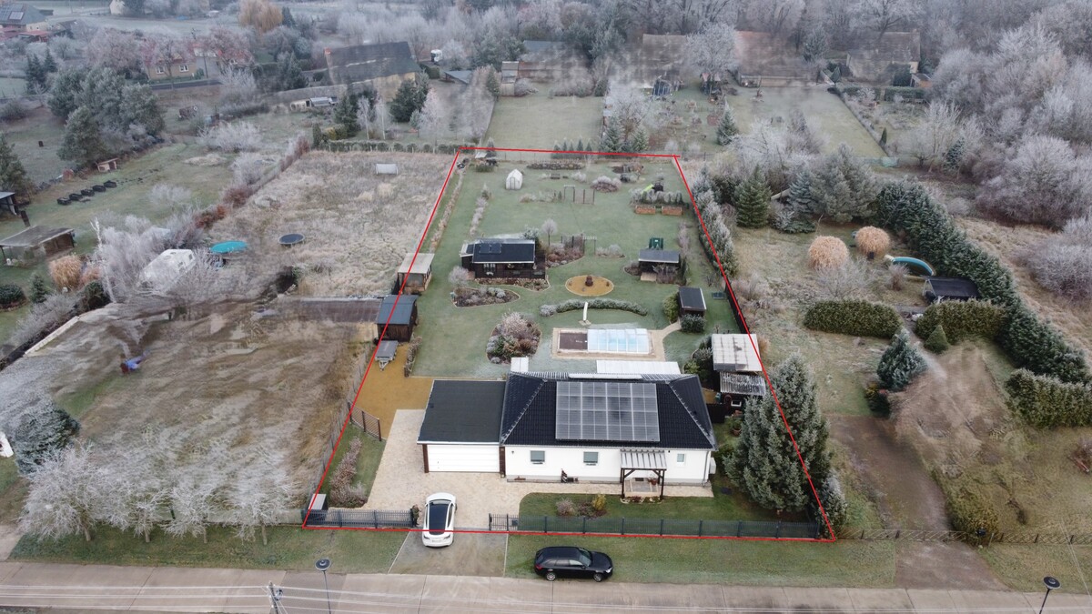 | Objektbeschreibung | Dieses freistehende, moderne und neuwertige Einfamilienhaus im Baustil eines Bungalows mit Terrasse aus dem Jahre 2022 wurde in Massivbauweise auf dem 2.646 m² großem Grundstück hergestellt. Der individuelle Entwurf des Eigentümers wurde hier vom bekannten Massivhausanbieter Heinz von Heiden umgesetzt. Mit dieser Entscheidung wurde auf Erfahrung, bestmögliche Qualität der Materialien und der bewährten Bauausführung gesetzt. Hiervon werden auch künftige Eigentümer profitieren. Auf höchstem Niveau – alles durchdacht – vereint es doch mit seiner hochwertigen Ausstattung und guter Raumaufteilung ein modernes Wohnen mit einem angenehmen Raumgefühl. Der Gutspark-Waldblick in Richtung Norden ist und bleibt unverbaut. Hier steht schon für Sie und Ihre Kinder ein Klettergerüst, eine Feuerstelle und ein Pool. Der Platz für ein Trampolin ist auch ausreichend vorhanden. Durch den Hauseingang gelangt man in den großzügigen Flur. Die ca. 98 m² Wohnfläche in einer Ebene teilen sich wie folgt auf: Durch die erste Tür rechts gelangt man in den Hauswirtschaftsraum. Hier befinden sich die Hausanschlüsse, der Waschmaschinenanschluss, die Heizung mit 300 l-Warmwasserspeicher, der Sicherungs- und Zählerkasten, der Solar-Wechselrichter, die Smart Home-Anlage und der Batteriespeicher der Firma SENEC. Wie jedes Zimmer im Haus hat auch der HWR ein Fenster. Herzstück des Hauses ist das Wohnzimmer mit Essbereich, offener Küche und über Schiebetüren Zugang zur Terrasse. Im Flur erste Tür links befindet sich das Tageslichtbad mit WC, Waschbecken, Eck-Wanne, Dusche und Handtuchtrockner. Wie im ganzen Haus erzeugt die Fußbodenheizung eine angenehme Wärme. Daneben befindet sich das derzeit als Büro genutzte Zimmer. Gegenüber gelangen Sie in das Eltern-Schlafzimmer ....... |